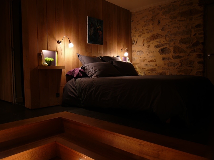 La chambre est meublée sobrement, mais le lit a été placé sur une estrade, ce qui apporte aussi beaucoup de cachet à la pièce. Le linge de lit est uni et sobre, pour ne pas faire ombrage aux éléments phares dans la décoration de cette chambre : la pierre et le bois. Ces tonalités grises choisies par les propriétaires font écho à la tradition des toits en ardoise, omniprésents dans la région.