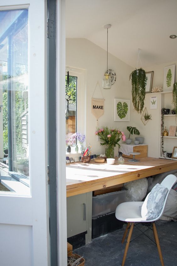 Ici encore, c’est un bureau-atelier, celui de la céramiste Katie Robbins. Ses points forts : une pièce baignée de lumière, un grand bureau tout simple et l’omniprésence des végétaux avec les fleurs et plantes véritables mais aussi les illustrations botaniques. Une jolie suspension lumineuse complète agréablement cet espace.