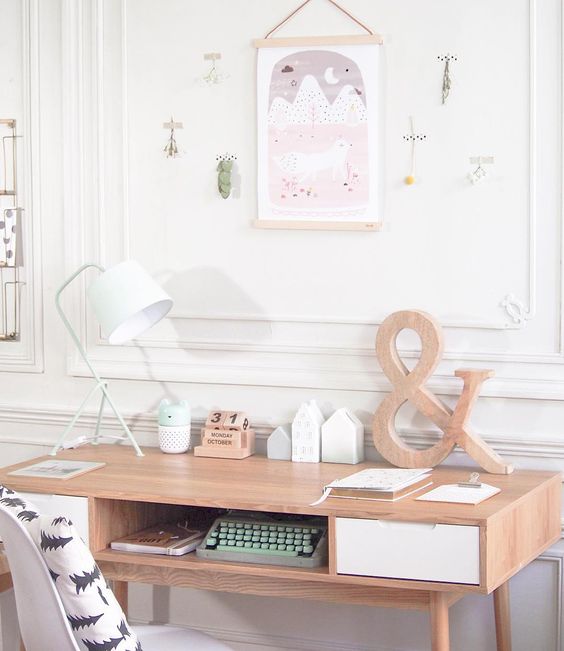 Chez Charlotte and the tea pot, illustratrice lyonnaise, c’est l’esprit pastel et scandinave qui domine, en phase avec l’univers doux et poétique de la créatrice. J’adore les touches personnelles qu’elle a ajouté pour personnaliser cet espace de travail : une grande illustration suspendue, la machine à écrire ancienne, l’esperluette en bois, les jolies maisons en céramique et un beau cahier.