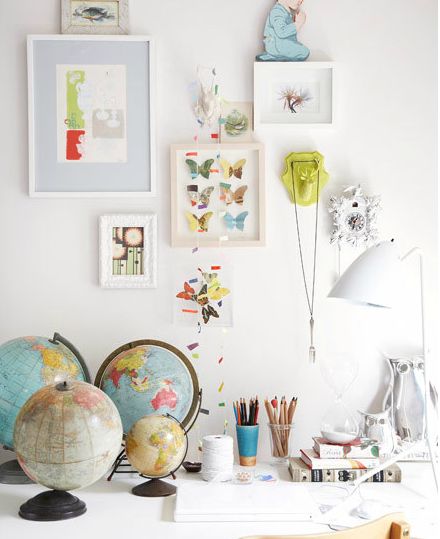 Ici, les éléments de décoration ont presque envahi tout le bureau, mais le résultat est charmant. Coup de cœur en particulier pour la jolie collection de globes terrestres anciens qui ajoutent énormément de cachet à cet espace !
