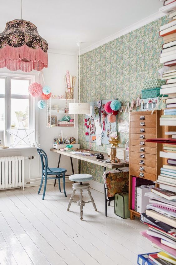 Le parti-pris de ce bureau : vintage, vintage, vintage ! On a choisi un papier-peint fleuri « à l’ancienne » pour recouvrir le mur derrière le bureau. L’esprit ‘ »décoration de grand-mère » est complété par une suspension rétro à passementerie et des chaises vintage et par un vieux meuble de métier à tiroirs. Le résultat final fonctionne bien car on a habilement contrebalancé ces touches de décoration à l’ancienne par des éléments contemporains : les lampions en papiers de soie pastel disposés en grappe, le bureau sobre et l’apport de nombreuses touches blanches pour « calmer le jeu ».